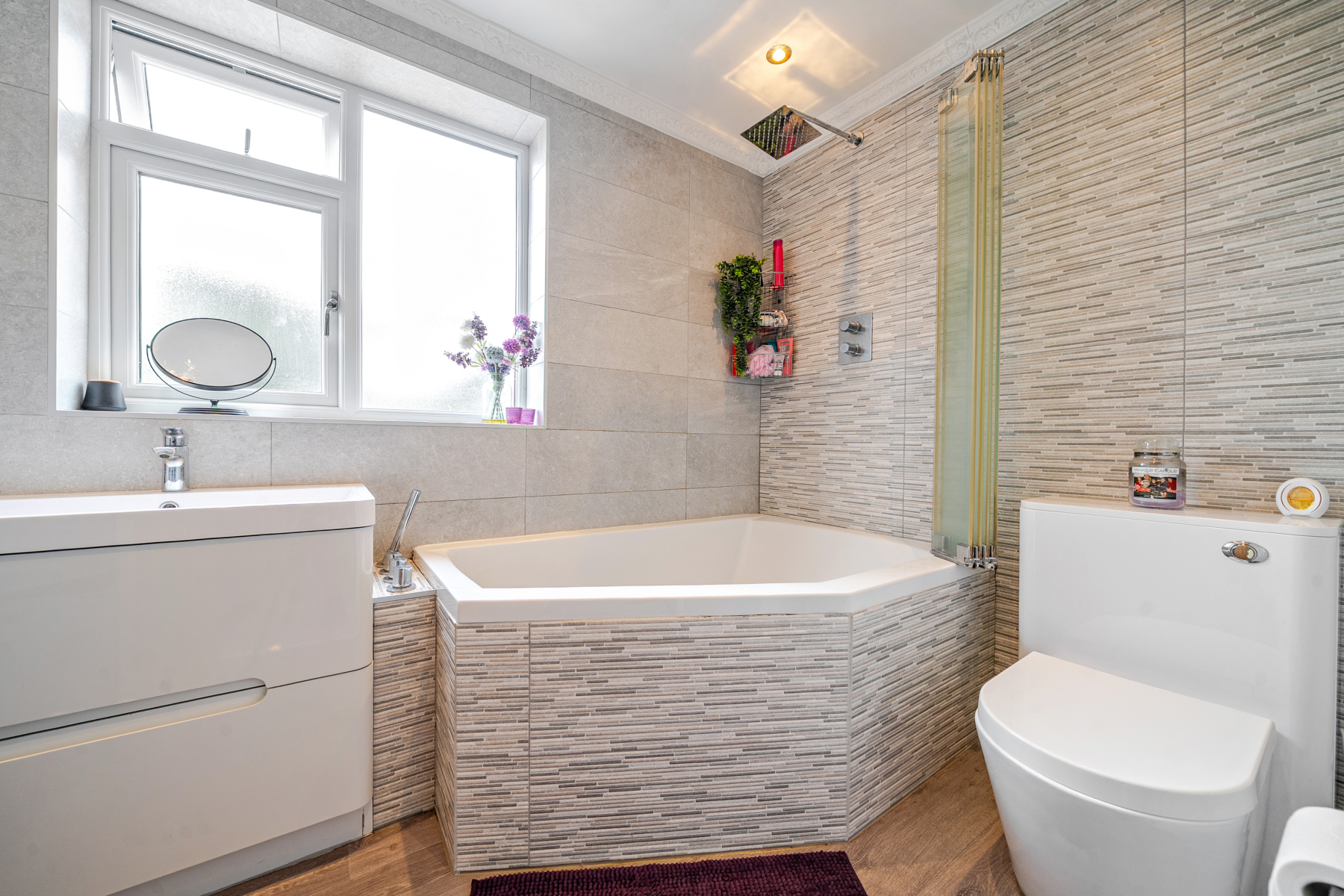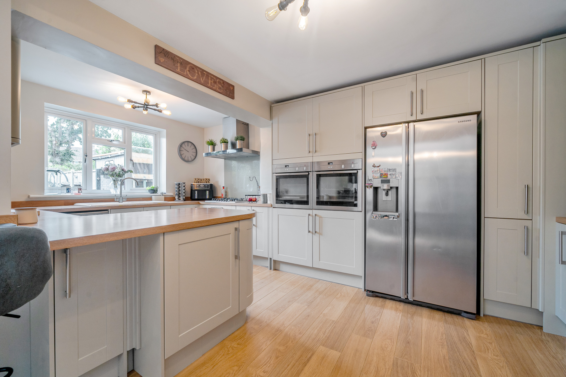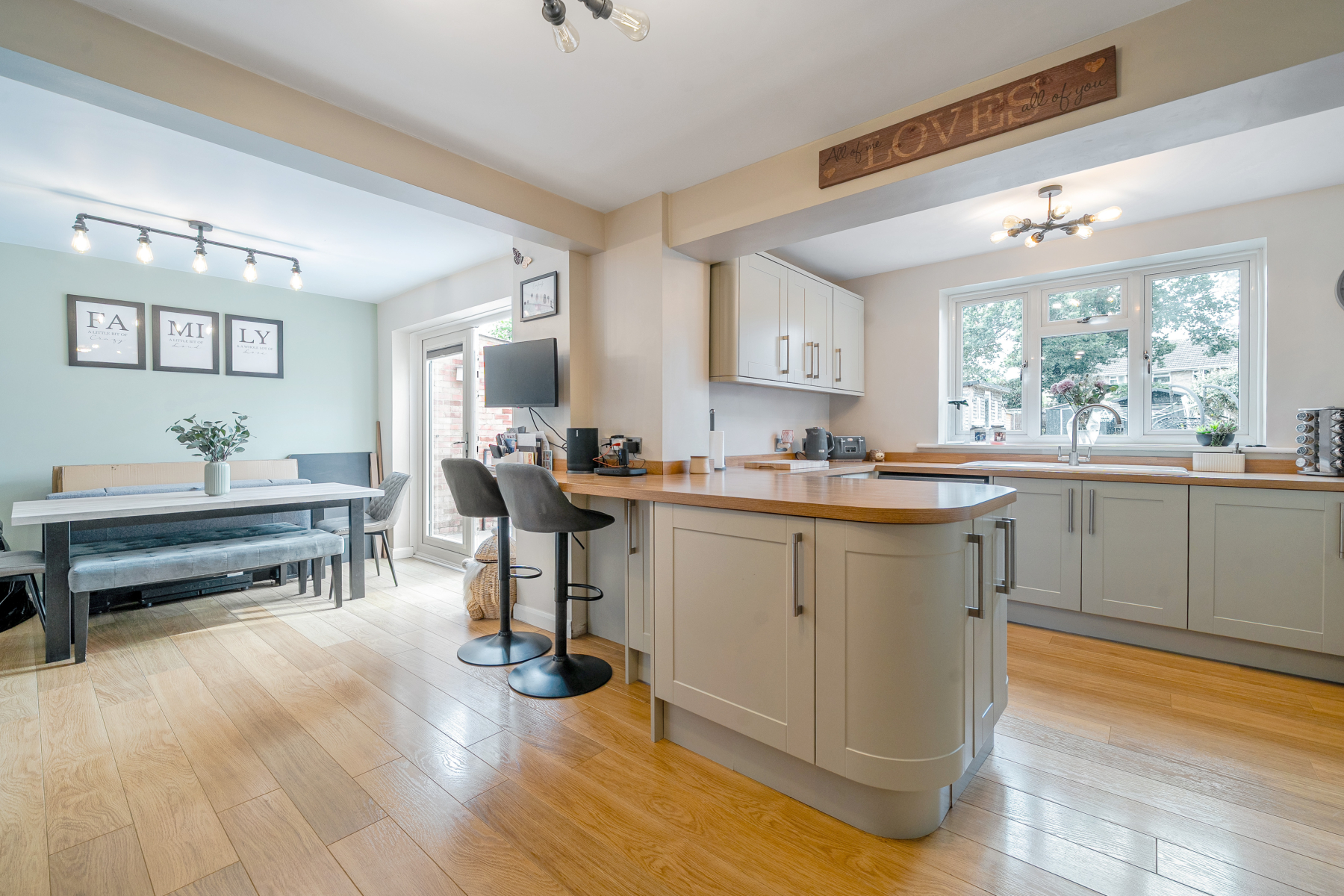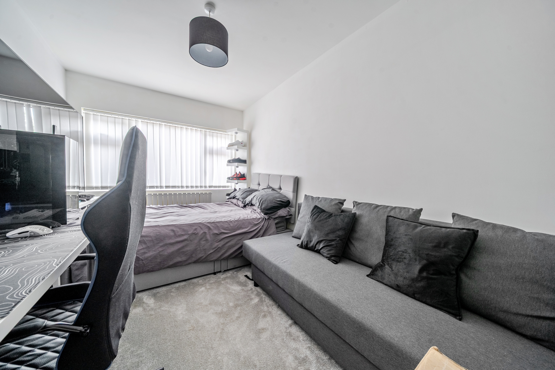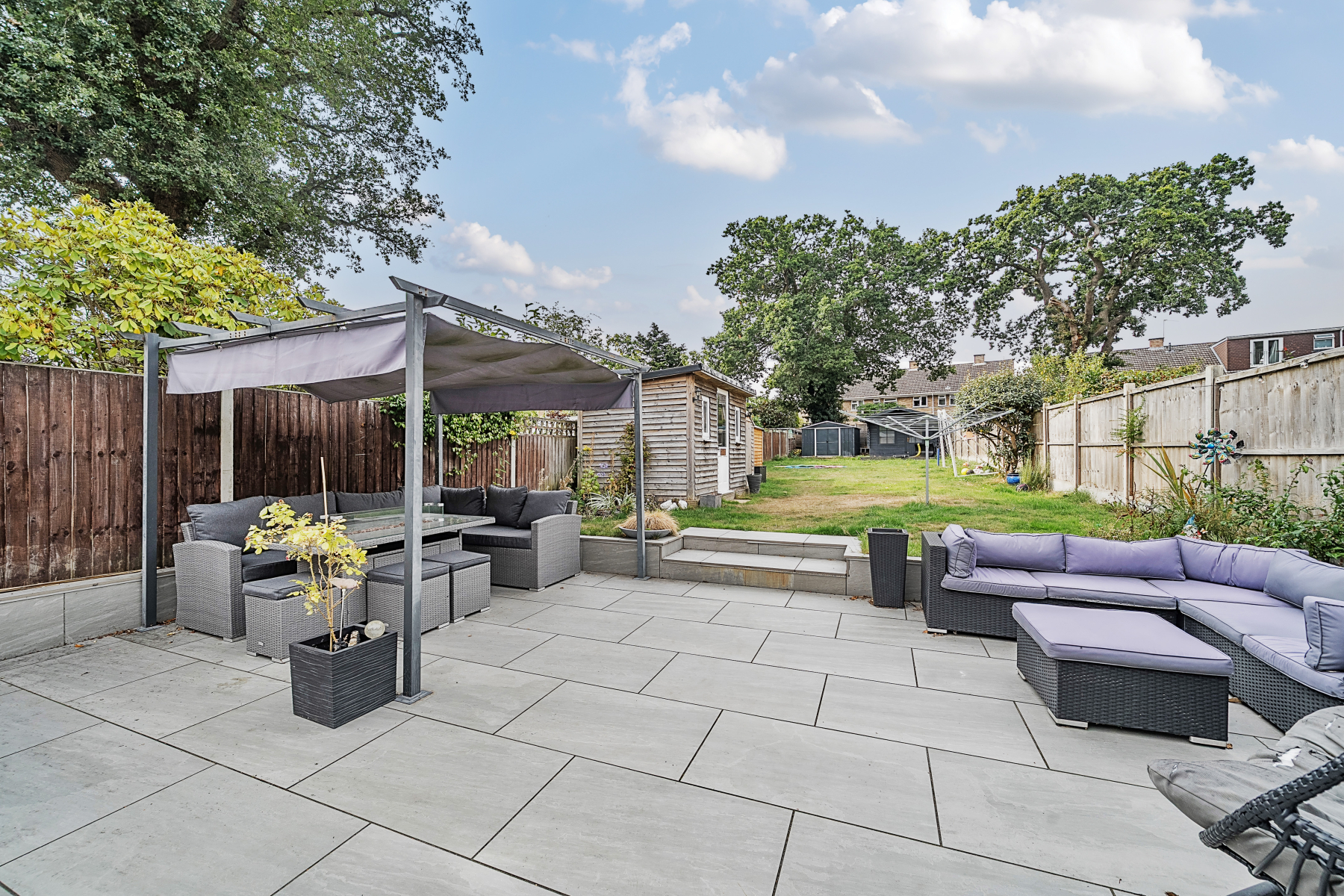 Upstairs, the home comprises three generously sized double bedrooms and one single bedroom, while the ground floor offers two reception rooms—one of which can easily be used as a fifth bedroom, home office, or formal dining room. At the rear of the property, a bright and spacious open-plan kitchen and dining area is fitted with modern units and opens directly onto a large patio, ideal for entertaining. Beyond the patio lies a substantial 160ft garden, complete with a sunken trampoline, powered outbuilding, and a storage shed—perfect for families and outdoor enjoyment. The property also benefits from a private driveway providing off-street parking for two cars.